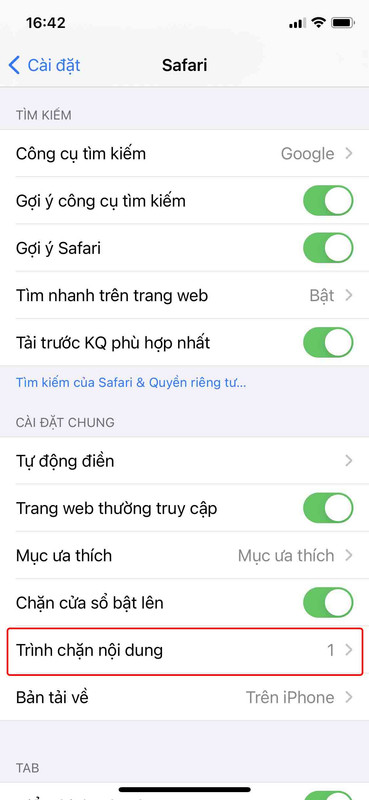 Bước 3: Ứng dụng sẽ chuyển bạn vào Safari trong Cài đặt. Tại đây, bạn nhấn chọn vào phần Trình chặn nội dung.